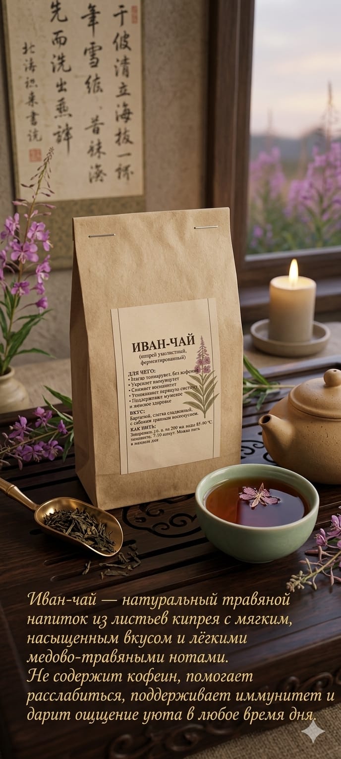 Иван-чай (кипрей) — это травяной напиток без кофеина, который пьют для мягкой поддержки организма и спокойного тонуса. Его часто выбирают вместо обычного чёрного чая, особенно вечером.