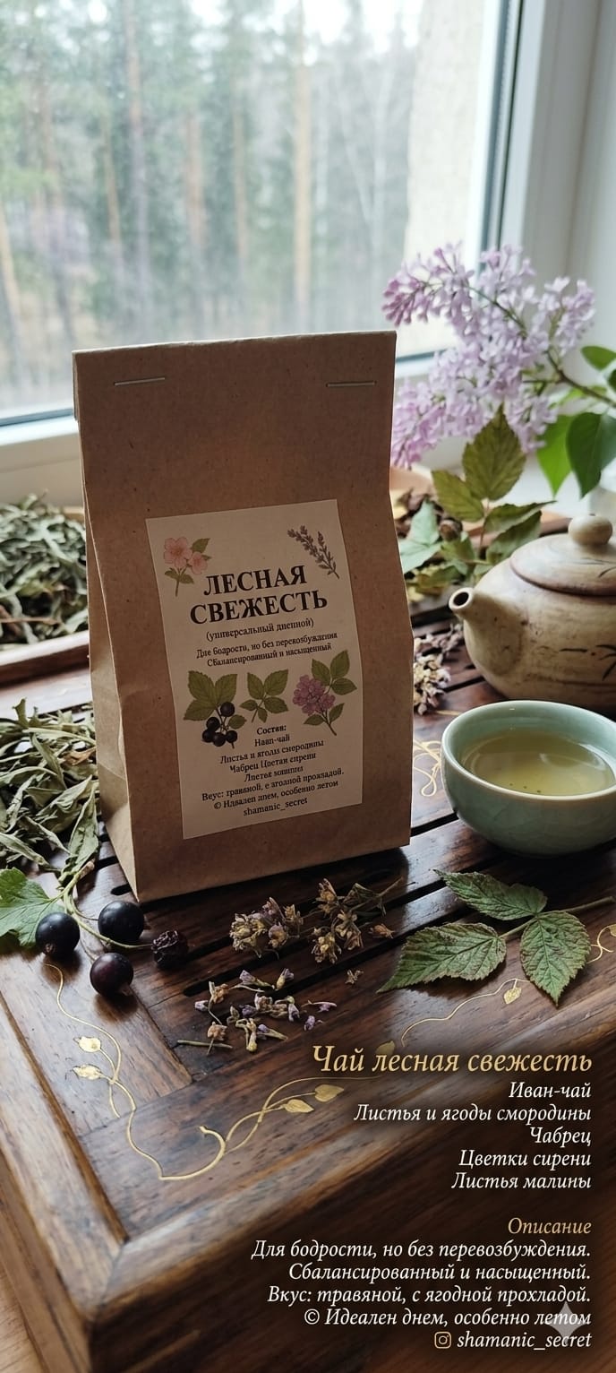 Нежная основа из иван-чая мягко раскрывается ягодно-листовыми нотами смородины и малины, создавая глубокий природный вкус с лёгкой сладостью. Чабрец добавляет травяную свежесть и тёплый лесной аромат, а цветки сирени дарят напитку тонкий цветочный шлейф и ощущение весенней лёгкости.
